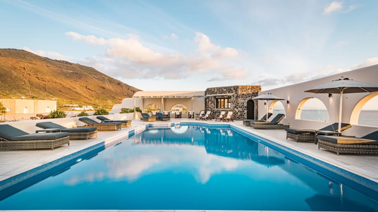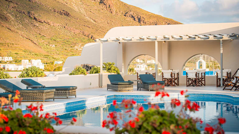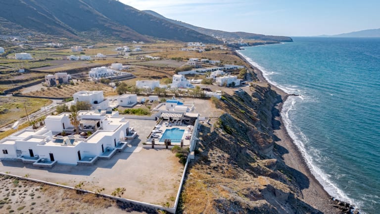Das Hotel Agia Irini befindet sich an der Ostseite von Imerovigli, in der Nähe des Strandes Pori und etwa 2 km vom Dorf Imerovigli entfernt. Die geschäftige Stadt Fira ist 4 km entfernt und der Flughafen von Santorin liegt 10 km vom Hotel entfernt.