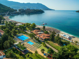 Die Ferienanlage befindet sich direkt im Zentrum von Budva, zehn Minuten zu Fuss von der Alten Stadt und ungefähr 20 Minuten Fahrt vom Flughafen Tivat entfernt. Die Lage an der Strandpromenade ist durch eine Strasse vom Strand ‚Slovenska plaža beach‘ getrennt, welcher öffentlich zugänglich ist. Entfernungen: Flughafen Tivat ca. 20 km, Flughafen Podgorica ca. 60 km, Bus ca. 50 m, Strand Slovenska plaza beach ca. 50 m, Stadtzentrum/Ortszentrum Old Town Budva ca. 600 m.