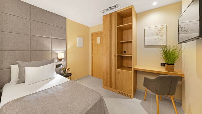 Das Hotel Almudaina bietet insgesamt 77 Zimmer auf 8 Etagen. Die Zimmer sind modern und komfortabel eingerichtet und verfügen über Klimaanlage, Heizung, einen Safe, einen Schreibtisch, einen Kühlschrank und kostenfreies WLAN. Einige Zimmer bieten zudem einen Balkon mit Blick auf die Bucht und die Kathedrale.