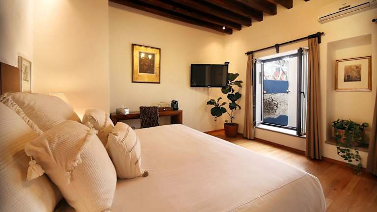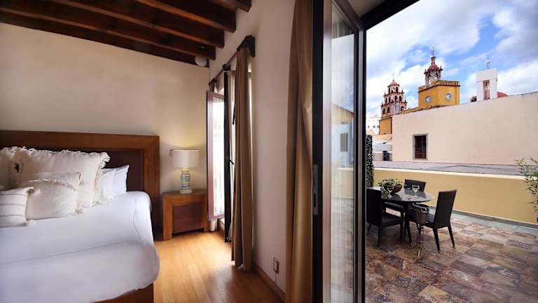 Die eleganten, klimatisierten Suiten bieten eine komfortable Ausstattung mit Flachbild-Sat-TV sowie Badezimmern, die mit Bademänteln und luxuriösen Pflegeprodukten ausgestattet sind. Viele Suiten verfügen zudem über eine Aussicht auf das historische Zentrum von Guanajuato.