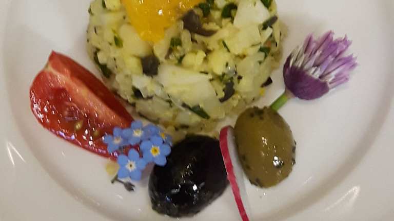 Halbpension mit reichhaltigem Frühstücksbüffet und ein Abendessen mit einem Drei-Gang-Menü.