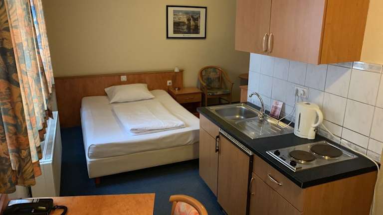 Die Zimmer sind mit einem Doppelbett und einem Sofabett ausgestattet. Für die kleinen Gäste stehen Kinderbetten zur Verfügung. Jedes Zimmer verfügt über eine Kochnische mit Kühlschrank, Mikrowelle und Tee-/Kaffeemaschine. Ein Bügelset, ein Telefon, Sat-TV und kostenloses WiFi stehen ebenfalls zur Verfügung. In den Badezimmern finden sich Haartrockner. Enspannende Nichtraucherzimmer sind ebenfalls vorhanden.