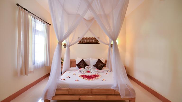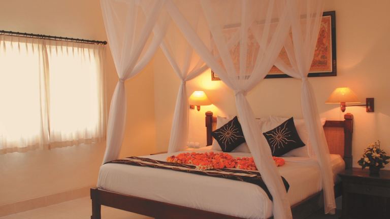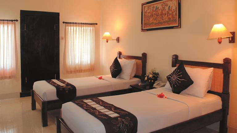 Das Hotel verfügt über insgesamt 59 Zimmer, darunter Doppelzimmer und Apartments. Die Zimmer sind im traditionellen balinesischen Stil eingerichtet und bieten Ihnen einen komfortablen Rückzugsort während Ihres Aufenthalts. Zur Ausstattung gehören eine Klimaanlage, ein Balkon oder eine Terrasse, ein TV-Gerät, eine Minibar und kostenfreies WLAN. Die Badezimmer verfügen über eine Dusche oder eine Badewanne und sind teilweise rollstuhlgerecht ausgestattet.