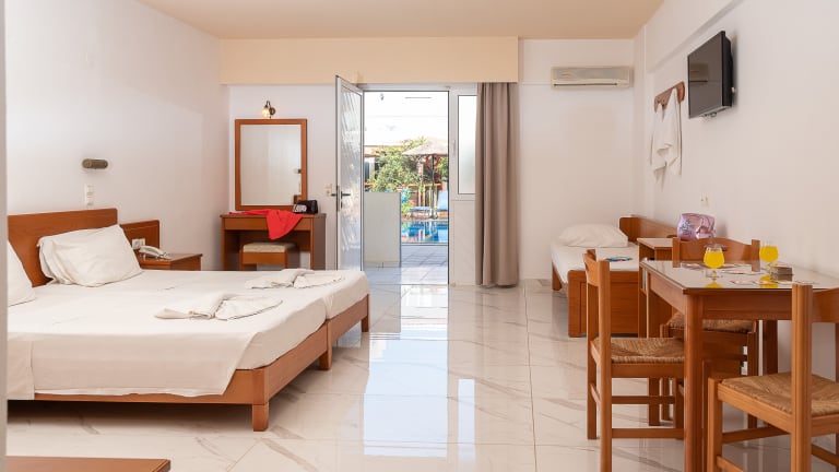 Die Zimmer im Hotel Anthoula Village verfügen über ein eigenes Bad mit Dusche oder Badewanne, WC und Föhn. Zur weiteren Ausstattung gehören Klimaanlage (gegen Gebühr), Fernseher, Telefon, Safe (gegen Gebühr) sowie ein Balkon oder eine Terrasse.