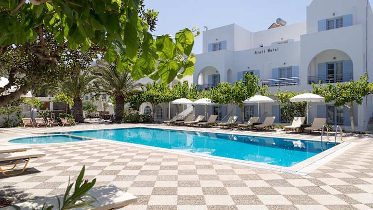 Das Hotel Areti bietet eine ruhige und autofreie Umgebung unterhalb des antiken Thira, ideal für entspannende Aufenthalte. Es verfügt über eine Gartenanlage, Dachterrasse und Sonnenterrasse sowie einen Pool, der von Mai bis Oktober geöffnet ist. Die Anlage besteht aus zwei Gebäuden und umfasst insgesamt 22 Zimmer.