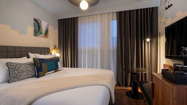 Die Zimmer in der Unterkunft Les Artistes sind mit einem Kleiderschrank, einem Schreibtisch, einem Flachbild-TV und einem eigenen Badezimmer mit Dusche und Haartrockner ausgestattet. Die Gäste können die ansprechende Aussicht auf die Stadt geniessen.