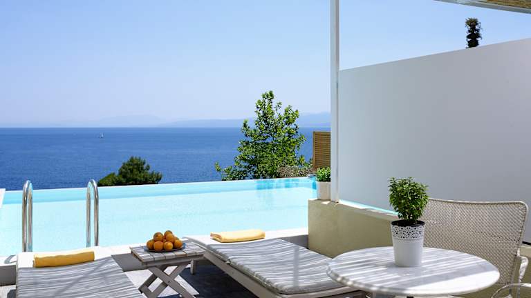 Alle Gästezimmer (Standard Doppelzimmer, Doppelzimmer mit Garten-Whirlpool, Superior Doppelzimmer, Familienzimmer, Junior Suite, Maisonette und Junior Suite mit privatem Pool) verfügen über geräumige private Balkone oder Terrassen mit Blick auf das Meer. Jedes Zimmer ist mit Direktwahltelefon, Satellitenfernsehen, W-LAN, Safe, Kühlschrank, Klimaanlage, Badezimmer mit Badewanne, Dusche, Haartrockner und Kosmetik ausgestattet.