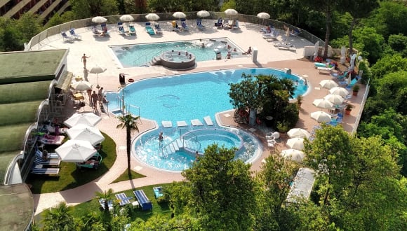 Ein Alleinstellungsmerkmal des Hotels Terme Augustus sind mit Sicherheit die 3 Thermalschwimmbecken mit Panoramablick, die in den Euganeischen Thermen einzigartig sind. Die Thermalschwimmbecken befinden sich oben auf dem Hügel neben dem Hauptgebäude und sind vom sechsten Stock des Hotels aus über eine praktische Brücke erreichbar. Das Thermalschwimmbecken im Innenbereich verfügt über Aqua-Cycling und Hydromassage. Daneben befinden sich eine finnische Sauna und emotionale Duschen. Die bequemen Liegen am Rand des Schwimmbeckens bieten sich für entspannte Momente an. Die anderen beiden Thermalschwimmbecken befinden sich im Außenbereich. Das erste Thermalschwimmbecken ist mit Hydromassage, Kaskaden, japanischem Parcour und Jacuzzi-Becken ausgestattet. Das andere Thermalschwimmbecken hat eine etwas niedrigere Wassertemperatur und ist für Gäste gedacht, die auch im Urlaub in den Thermen nicht darauf verzichten möchten, ein paar Bahnen zu schwimmen. Von den Thermalschwimmbecken aus hat man in alle Richtungen einen wundervollen Ausblick, der von der Stadt Abano über die Stadt Montegrotto bis zu den malerischen Euganeischen Hügeln reicht, die zu jeder Jahreszeit ein großartiges Panorama bieten. Von den Thermalschwimmbecken hat man Zugang zu einer großen Sonnenterrasse, auf der die Hotelgäste die Sonne und die Stille vor diesem wundervollen Panorama genießen können.