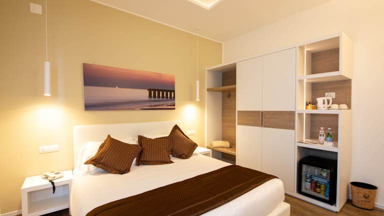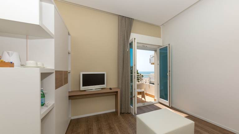 Die klimatisierten Zimmer im Hotel Aurora bieten einen Balkon mit Tisch und Stühlen, von dem aus Sie einen Blick auf das Meer oder die Piazza Aurora genießen können. Jedes Zimmer ist mit einem LCD-Sat-TV und einem eigenen Bad mit Haartrockner und Pflegeprodukten ausgestattet.