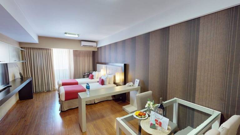 In den Zimmern stehen eine Klimaanlage und individuell regelbare Heizung zur Verfügung. Die meisten Zimmer verfügen über einen Balkon. Bequem schlafen die Gäste in einem Doppelbett. Des Weiteren sind ein Safe und ein Schreibtisch vorhanden. Die Kochnische ist mit einem Kühlschrank, einem Minikühlschrank, einem Herd, einer Mikrowelle, einer Tee-/Kaffeemaschine und einem Backofen ausgestattet. Ein Bügelset sorgt für zusätzlichen Komfort. Jedes Zimmer ist zudem mit einem Telefon mit Direktwahl, einem TV-Gerät mit Satelliten-/Kabelempfang, einem Radio, einer Stereoanlage und kostenlosem Internet ausgestattet. Die Badezimmer verfügen über eine Dusche, eine Badewanne und ein Bidet, sowie einen Haartrockner und Kosmetikartikel. Rollstuhlgerechte Zimmer sind ebenfalls verfügbar.