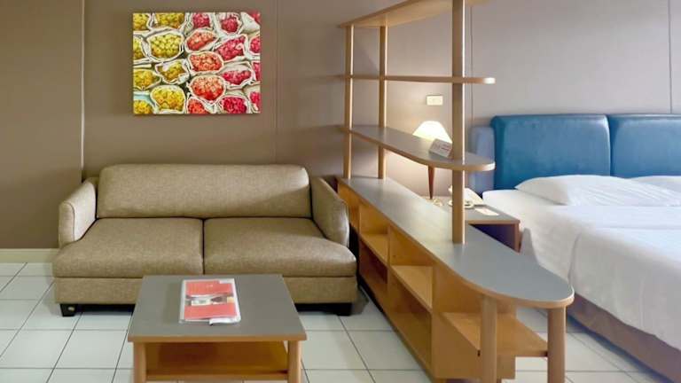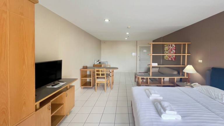 Die klimatisierten Zimmer im BU Place Hotel sind geräumig und verfügen über einen eigenen Balkon. Sie sind ausgestattet mit kühlen Holz- oder Fliesenböden, einem Sitz- und Essbereich, einem Kühlschrank, Sat-TV und einem eigenen Bad.