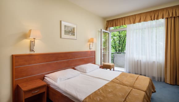 Als Verpflegung können die Gäste Halbpension, Vollpension, Frühstück, Mittagessen oder Abendessen wählen. Im Hotel sind abwechslungsreiche Frühstücksarten wie zum Beispiel ein Frühstücksbuffet zu bekommen. Das Angebot an Verpflegung bietet gutbürgerliche und internationale Speisen. Zudem sind ebenso vegetarische,diabetiker Speisen auswählbar. Nur zehn Minuten trennen Sie von vielen Gastlokalen, wie dem Restaurant Bagolyvár und dem Restaurant Gundel.