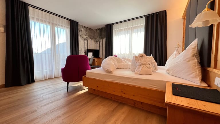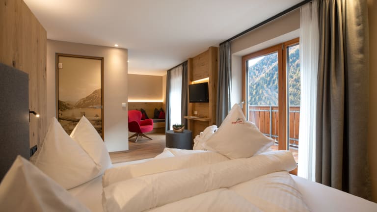 Die Zimmer und Suiten im Beerenhotel Bergfrieden sind gemütlich mit hellen, einheimischen Hölzern ausgestattet und verfügen alle über einen Balkon.