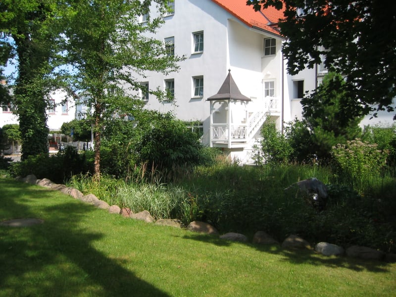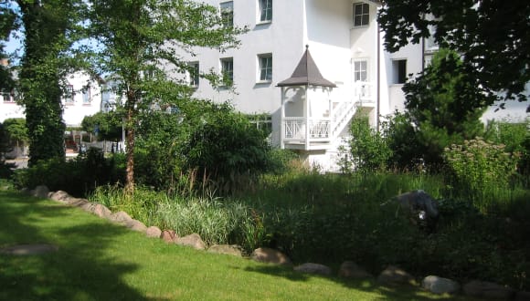 Der Wohnpark Binz mit Rezeption und Appartements für 1 – 10 Personen. Reizvoll ist der Park mit seinem schönen alten Baumbestand und dem Gartenteich mit Springbrunnen. Bänke in den gepflegten Gartenanlagen laden zum Verweilen ein. Direkt gegenüber vom Feriendomizil Binz befindet sich die Villa Ettina mit einem Hallenbad exklusiv für Gäste des Feriendomizils.