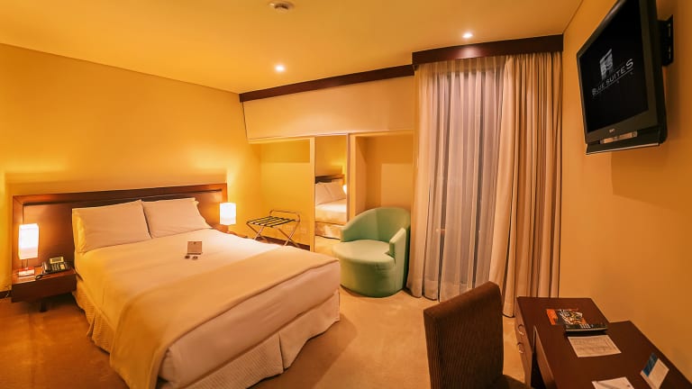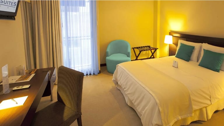 Das Hotel Blue Suites verfügt über insgesamt 40 Zimmer, inklusive 8 Junior-Suiten, 2 Suiten, 20 Einzel- und 10 Doppelzimmer, verteilt auf 6 Etagen, die über einen Aufzug erreichbar sind. Zur Ausstattung gehören eine rund um die Uhr besetzte Rezeption, eine Gepäckaufbewahrung, ein Safe und eine Wechselstube. WLAN steht in den öffentlichen Bereichen zur Verfügung. Zudem bietet das Hotel behindertengerechte Einrichtungen sowie einen Kamin, Geschäfte, einen TV-Raum und eine Sonnenterrasse. Für Gäste, die mit dem Auto anreisen, gibt es Parkiermöglichkeiten ohne Gebühr. Zu den weiteren Dienstleistungen gehören ein 24h-Sicherheitsdienst, Zimmer- und Wäscheservice sowie medizinische Betreuung.