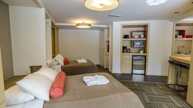 Die Zimmer sind mit Klimaanlage und Heizung ausgestattet und verfügen über ein Queensizebett sowie ein Sofabett. Zustellbetten können auf Anfrage bereitgestellt werden. Jedes Zimmer bietet einen Safe, einen Kühlschrank, eine Tee- und Kaffeemaschine sowie ein Bügelset. Weiterhin sind Telefon, Sat-TV, Radio und kostenloses WiFi verfügbar. Die Badezimmer sind mit einem Haartrockner und Kosmetikartikeln ausgestattet. Das Hotel bietet Familien- und Nichtraucherzimmer sowie rollstuhlgerechte Unterkünfte.