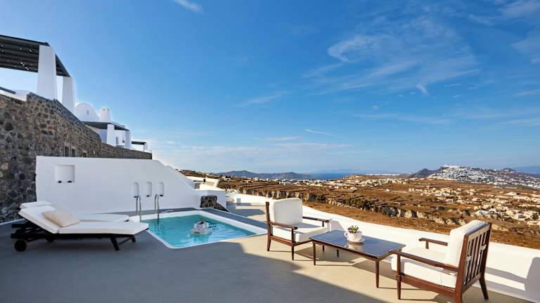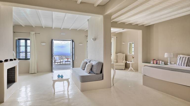 Die Suiten sind klimatisiert und in hellem, minimalistischen Design gehalten. Jedes Zimmer verfügt über ein Kingsize-Bett, einen Sitzbereich, einen LCD-TV, eine Minibar sowie eine private Terrasse oder einen Balkon mit Meerblick. Die Badezimmer sind mit Dusche und Badewanne ausgestattet. Für zusätzlichen Komfort stehen ein Safe, ein Kühlschrank und eine Tee-/Kaffeemaschine zur Verfügung. Kosmetikartikel, Hausschuhe und eine Auswahl an Kopfkissen runden die Annehmlichkeiten ab.