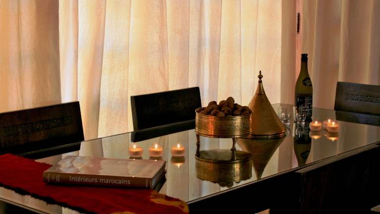 Täglich wird ein marokkanisches Frühstück serviert. Weitere Mahlzeiten sind auf Anfrage erhältlich und basieren auf der marokkanischen, mediterranen und thailändischen Küche, zubereitet mit Produkten aus dem eigenen Anbau. Es besteht die Möglichkeit, die Mahlzeiten im traditionellen Berberzelt zu geniessen. Kochkurse sind ebenfalls auf Anfrage verfügbar.