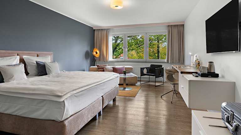 Großzügige Zimmer und exklusive Suiten, jedes Zimmer ist stilvoll, individuell und komfortabel eingerichtet. Warme Farben zaubern Wohlfühlambiente. Kleine Aufmerksamkeiten sind die Visitenkarte des First-Class-Wellnesshotels. Sie werden sich schnell wie zu Hause fühlen. Ausstattung allgemein Telefon, Fax-Anschluss Fernseher Schreibtisch Minibar Duschbad Haartrockner 45 Standard-Zimmer Landestypische Echtholzmöbel Teilweise Holzdeckenvertäfelung Badezimmer mit Dusche und Waschtisch 24 - 28 qm 46 Komfort-Doppelzimmer Classic Helle Echtholzmöbel Extra große Betten mit durchgehender Matratze Bettdecken mit Überlänge Badezimmer mit Dusche und Waschtisch Safe 26 - 30 qm 10 Komfort-Einzelzimmer Business Modern und luxuriös Vinyl Designboden Großer Schreibtisch Arbeitsdrehsessel Sitzecke mit Recamière Badezimmer mit Dusche und Waschtisch Safe in Laptopgröße 24 qm 2 Suiten Davon eine Wellness-Suite Details Exklusiv und großzügig Separater Arbeitsraum Safe 35 qm oder 42 qm