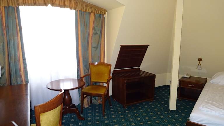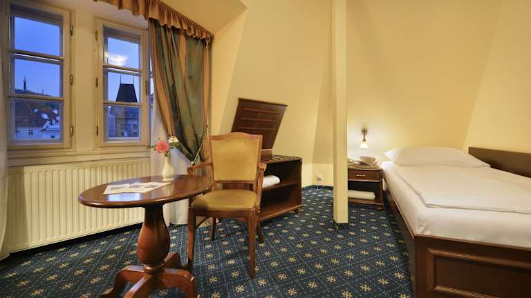 Die Zimmer im Hotel sind elegant eingerichtet und verfügen über eine Klimaanlage, Heizung, Sat-TV, Minibar sowie ein Badezimmer mit Haartrockner. Einige Zimmer bieten einen Blick auf die Karlsbrücke oder die Prager Burg. Zustellbetten sind auf Anfrage erhältlich. Besondere Annehmlichkeiten umfassen Hausschuhe, Kosmetikartikel sowie rollstuhlgerechte Zimmer. WLAN ist in den Zimmern verfügbar.