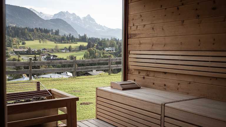360° Bergblick im Hotel & Chalets Grosslehen Ob im Hotelzimmer oder in einer der Suiten - unvergessliche Urlaubsmomente sind vorprogrammiert. Der hoteleigene Wellnessbereich mit verschiedenen Saunatypen und einem Ruheraum sowie auch der Fitnessraum bieten neben purer Erholung auch grandiose Ausblicke auf die Tiroler Bergwelt frei. Neben einem Urlaub im Hotel können Sie Ihre wertvollsten Tage im Jahr auch ganz privat in einem der sechs Luxus Chalets genießen. Dort erwartet Sie, neben einem unvergleichlichen Panoramaausblick, eine Ausstattung im alpinen Tiroler Stil, eine voll ausgestattete Küche, drei Schlafzimmer und ein großzügiger Wohnraum zum Entspannen. Den Höhepunkt der Luxus Chalets finden Sie jedoch im Badezimmer: eine private Sauna, die Sie ungestört rund um die Uhr nutzen können.