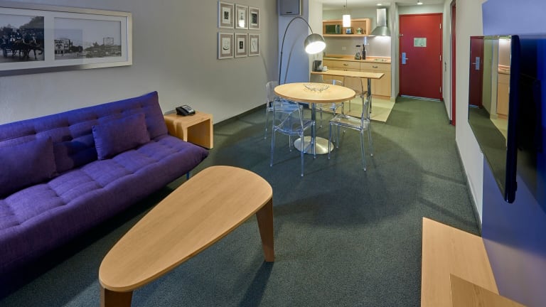 Die klimatisierten Zimmer sind modern eingerichtet und verfügen über ein Queensizebett, ein Sofabett, einen Safe, eine Minibar und eine Schreibtisch. Zur Zusatzausstattung zählen eine Mikrowelle und eine Tee-/Kaffeemaschine. Die Badezimmer sind mit einer Dusche und einer Badewanne versehen und bieten einen Haartrockner.