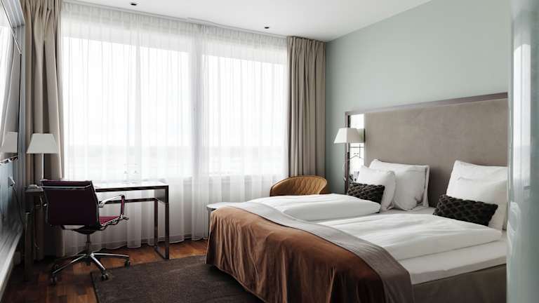 Die Zimmer sind mit modernem Mobiliar, Holz- oder Teppichböden ausgestattet. Zu den Annehmlichkeiten gehören Klimaanlage, ein Flachbild-Sat-TV, ein Schreibtisch, ein Kühlschrank, eine Minibar und eine Tee-/Kaffeemaschine. Die Badezimmer verfügen über eine Dusche und einen Haartrockner. Es sind verschiedene Zimmertypen verfügbar, darunter Familienzimmer, Nichtraucherzimmer und rollstuhlgerechte Zimmer.
