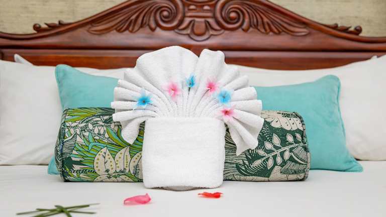 Die hellen Zimmer sind im tropischen Stil eingerichtet und mit einem Kühlschrank sowie einer Kaffeemaschine ausgestattet. Alle Zimmer verfügen über Parkett oder Fliesenboden und Holzmobiliar. Einige Zimmer bieten einen privaten Balkon mit Aussicht.