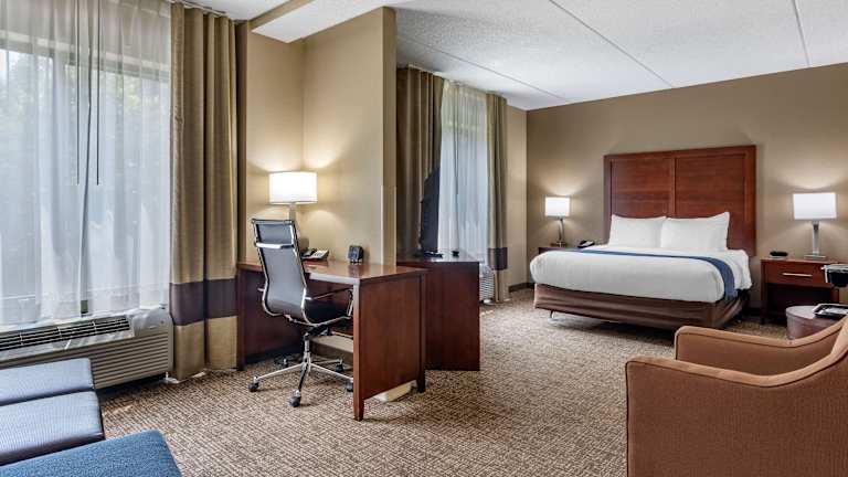 Das Hotel Comfort Suites Manchester bietet insgesamt 77 Nichtraucherzimmer und verschiedene Annehmlichkeiten, die den Gästen einen angenehmen Aufenthalt garantieren. Dazu zählen ein Safe, ein Konferenzraum, ein Businesscenter und eine Münzwäscherei. Die Unterkunft verfügt über sowohl einen Innen- als auch einen Aussenpool, welche ideal für entspannende Momente sind. Rollstuhlgerechte Einrichtungen sind ebenfalls vorhanden. Die Gäste haben die Möglichkeit, ihr Fahrzeug kostenlos auf einem Parkplatz abzustellen, der nach Verfügbarkeit genutzt werden kann. Kostenloses Wifi steht allen Gästen in der Unterkunft zur Verfügung.