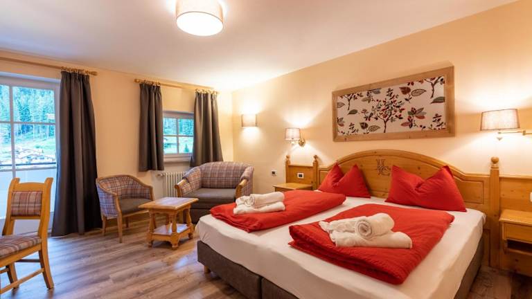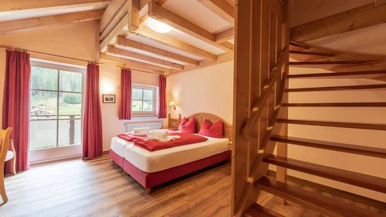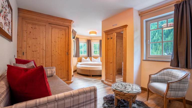 Die traditionell eingerichteten Zimmer im Hotel Conturina verfügen über Parkettböden und ein eigenes Bad mit Haartrockner. Einige Zimmer liegen im Dachgeschoss, während die im Turm Panoramafenster bieten, die einen herrlichen Blick auf die Dolomiten oder den Garten gewähren.