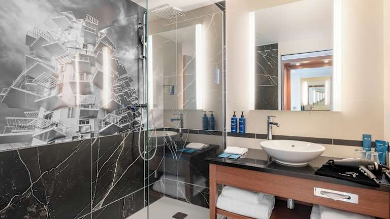 Die Zimmer sind klimatisiert und individuell beheizbar. Jedes Zimmer verfügt über einen Balkon oder eine Terrasse und ist mit Teppichboden ausgelegt. Die Ausstattung umfasst ein Doppelbett oder Kingsize-Bett, einen Safe, eine Minibar, einen Schreibtisch und einen Minikühlschrank. Auch eine Tee- und Kaffeemaschine ist vorhanden. Zusätzliche Annehmlichkeiten sind ein Telefon mit Direktwahl, ein TV-Gerät, ein Radio, Wifi sowie Hausschuhe. Die Badezimmer sind mit Dusche und Badewanne ausgestattet und bieten einen Haartrockner und Bademäntel.
