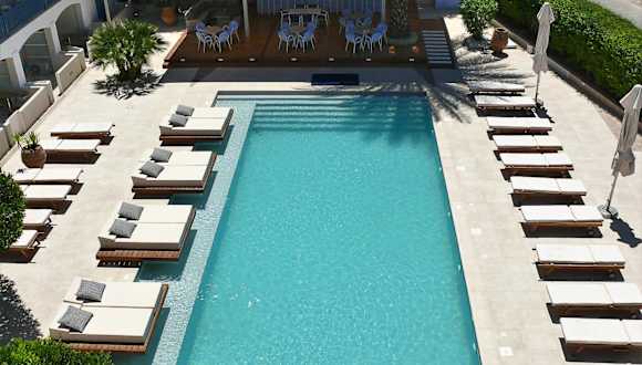 Die Aussenanlage umfasst einen schön gestalteten Swimmingpool mit Kinderbecken sowie eine Terrasse mit Sonnenliegen und Sonnenschirmen. Zur Verfügung stehen eine Pool-/Snackbar sowie verschiedene Wellnessangebote, darunter eine Sauna. Aktive Erholung und Aquatraining sind hier möglich.