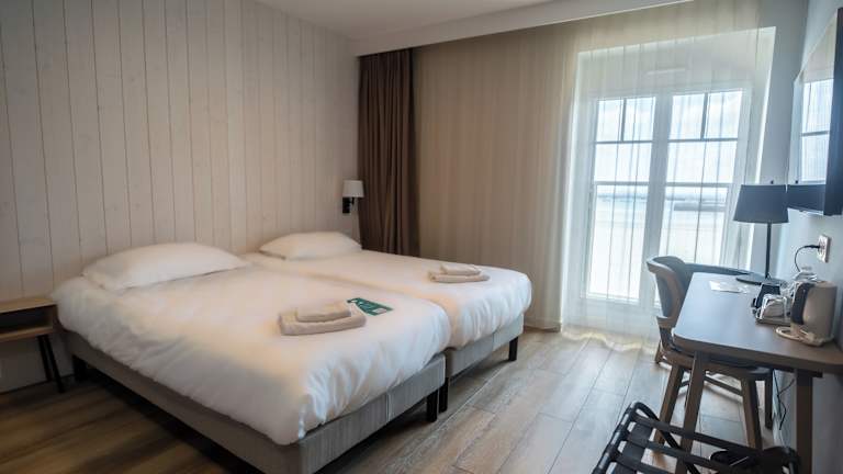 Die Zimmer im Hotel de la Baie sind en-suite und verfügen über ein eigenes Badezimmer mit Dusche. Sie sind mit einem LCD-TV sowie Tee- und Kaffeezubereitungsmöglichkeiten ausgestattet. Die helle, freundliche Einrichtung und die pastellfarbenen Akzente schaffen eine einladende Atmosphäre.