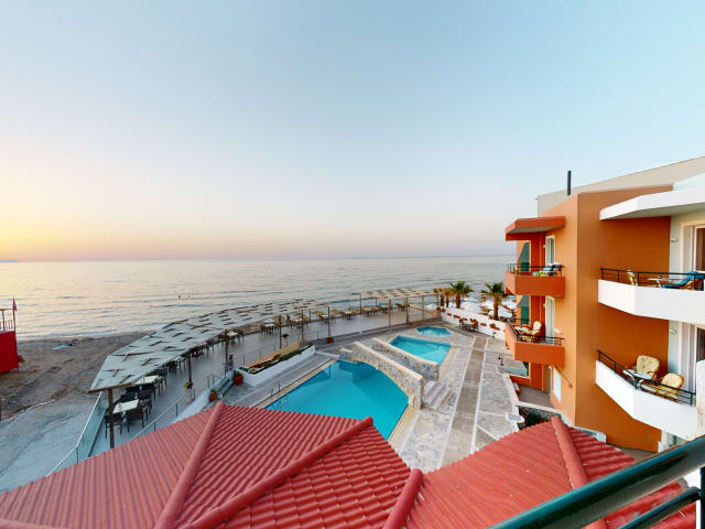 Das dedalos Beach Hotel bietet eine Empfangshalle mit Rezeption, einen Aufzug und mehrsprachiges Personal, das beim Ein- und Auschecken behilflich ist. Zu den Einrichtungen gehören ein Gepäckraum, ein Safe, WLAN zugänglich in den öffentlichen Bereichen, ein TV-Raum, ein Spielzimmer und eine Bibliothek. Eine Sonnenterrasse mit einem Aussenpool und einem separaten Kinderbecken ist vorhanden.