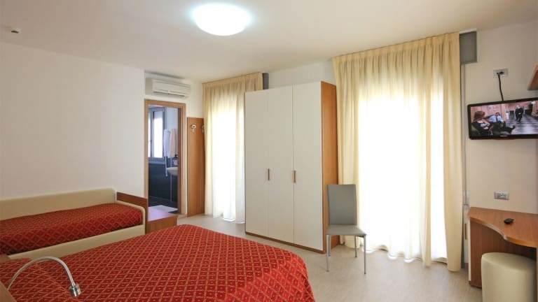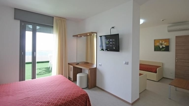 Die klimatisierten Zimmer sind elegant eingerichtet und verfügen über einen Flachbild-Sat-TV, einen Kühlschrank sowie Parkett. Jedes Zimmer bietet einen Balkon, und die Bäder sind mit einem Haartrockner und kostenlosen Pflegeprodukten ausgestattet. Einige Zimmer und die Suite bieten Aussicht auf die Adria.