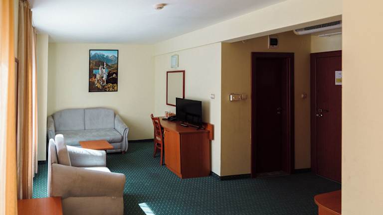 Die Zimmer sind mit Teppichböden ausgestattet und verfügen über einen Balkon oder eine Terrasse mit Blick auf die Strasse. Jedes Zimmer bietet ein Doppelbett sowie ein Sofabett. Zur Ausstattung gehören ein Safe, eine Minibar, ein Schreibtisch, ein Telefon mit Direktwahl, ein TV-Gerät mit Satelliten- und Kabelempfang sowie kostenloses Wifi. Die Badezimmer sind mit Dusche und Badewanne ausgestattet und bieten einen Haartrockner sowie Kosmetikartikel. Nichtraucherzimmer sind ebenfalls vorhanden.