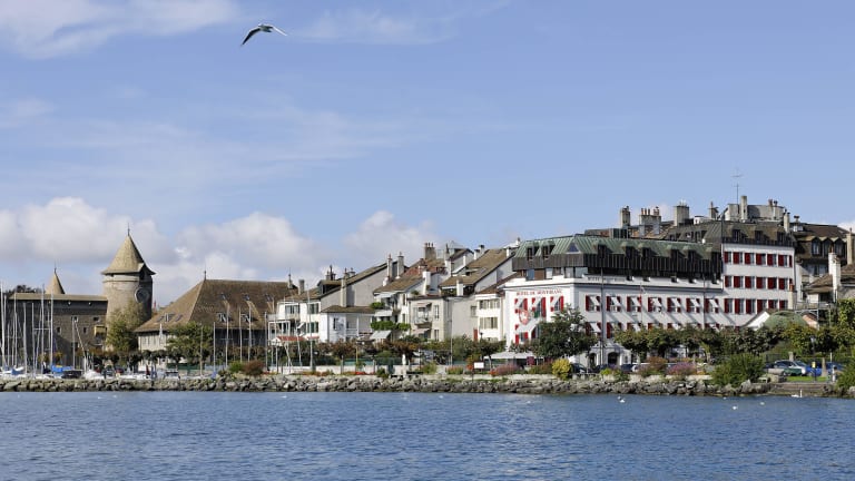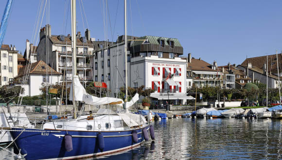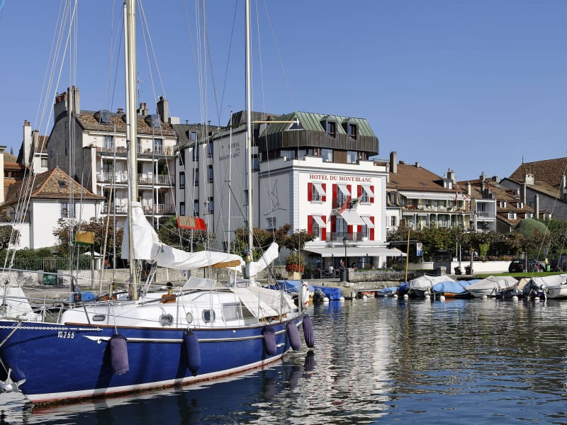 Das Hotel du Mont-Blanc au Lac befindet sich am Ufer des Genfersees in Morges, wo Gäste eine atemberaubende Sicht auf den majestätischen Mont Blanc geniessen können. Die Umgebung bietet eine ruhige Atmosphäre, die ideal ist, um nach einem langen Tag zu entspannen.