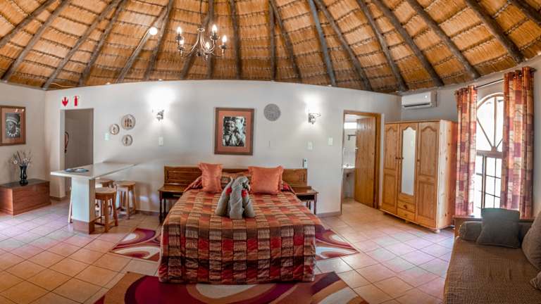 Die klimatisierten Zimmer sind im traditionellen afrikanischen Stil eingerichtet und verfügen über einen Balkon, einen Safe sowie eine Tee-/Kaffeemaschine. Die Badezimmer sind mit einer Dusche, einer Badewanne und einem Haartrockner ausgestattet. Zu den Annehmlichkeiten gehören zudem ein TV-Gerät und Wifi.