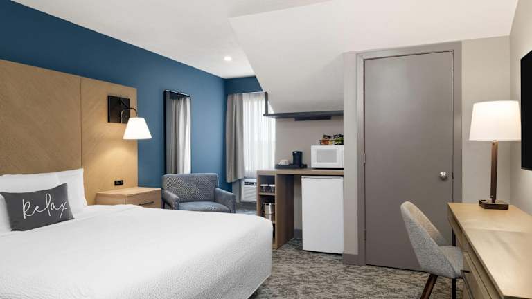 Die modernen Zimmer und Suiten sind ausgestattet mit einer Mikrowelle und einem Kühlschrank. Jedes Zimmer bietet kostenfreies Wifi und Kabel-TV. Suiten verfügen über eine voll ausgestattete Küche, einen Essbereich und einen 32-Zoll-Flachbild-TV.