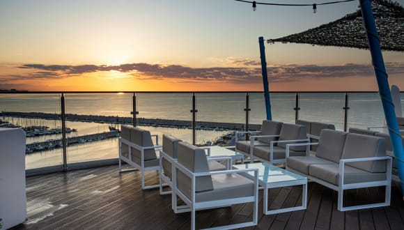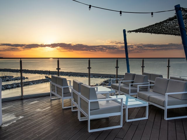 Ideale Lage an der Promenade, 30 m vom grauen Sandstrand entfernt und in der Nähe aller Geschäfte und Restaurants. Auf der Dachterrasse des Hotels gibt es einen Außenpool und eine neue Bar, die Sky Bar, mit herrlichem Meerblick. Das Hotel verfügt auch über eine Bar und ein Restaurant mit Buffetangebot.