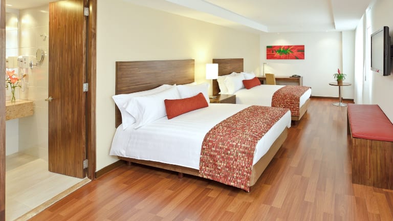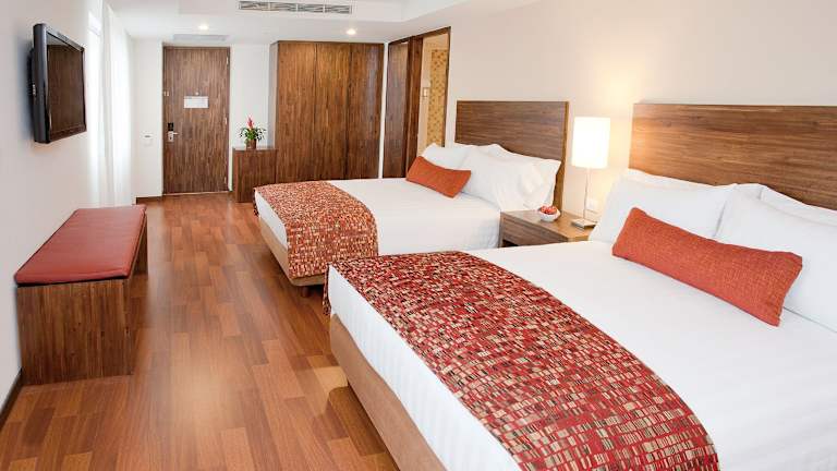 Die Zimmer sind klimatisiert und verfügen über ein Doppelbett sowie ein Sofabett. Zusätzliche Zustellbetten können angefragt werden. Zur Ausstattung gehören ein Safe, eine Minibar, eine Tee-/Kaffeemaschine und kostenfreies Wifi. Die Badezimmer sind mit Duschen ausgestattet. Das Hotel bietet auch Familien- und Nichtraucherzimmer sowie rollstuhlgerechte Zimmer.