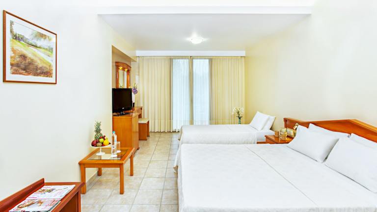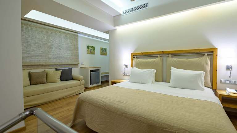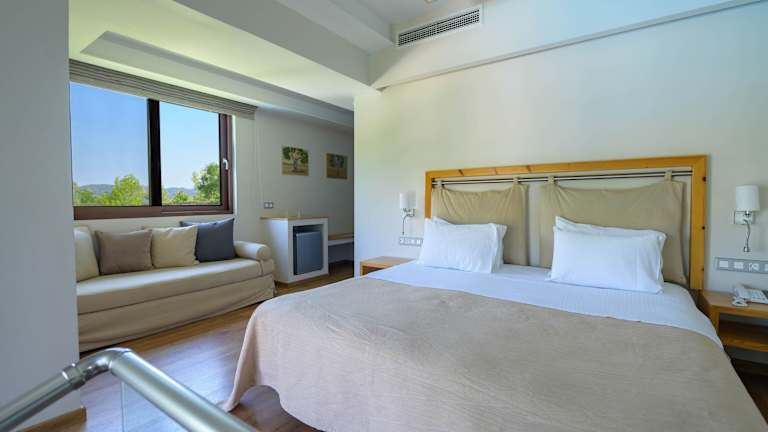 Die Zimmer sind klimatisiert und mit Marmorböden ausgestattet, verfügen über einen Balkon und bieten einen Blick auf den Garten. Zur Ausstattung gehören ein Kingsizebett, ein Sofabett, eine Minibar, ein Kühlschrank, sowie Tee- und Kaffeemaschinen. Die Badezimmer sind mit Dusche und Badewanne eingerichtet und bieten Haartrockner, Kosmetikartikel sowie Hintergrundmusik. Es stehen rollstuhlgerechte Zimmer zur Verfügung.