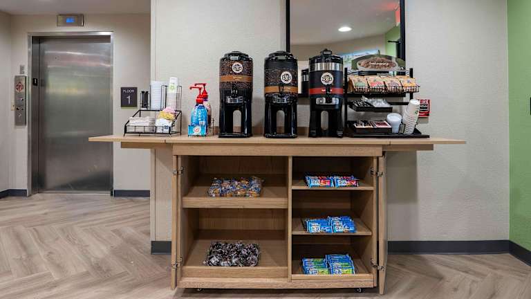 Jeden Morgen wird ein gratis Grab-and-go Frühstück serviert, das Frühstücksriegel, Muffins, heisse Cerealien, Kaffee und Tee umfasst.