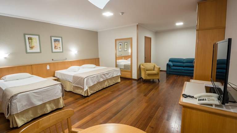 Die Zimmer des Hotels sind mit einem Kingsizebett, einem Sofabett und Zustellbetten ausgestattet. Zur Ausstattung zählen eine Klimaanlage, Heizung, ein Safe, eine Minibar, ein Schreibtisch sowie ein Minikühlschrank. Die Gäste können sich über einen Kaffee-/Teezubereiter, einen Flachbild-TV, kostenfreies Wifi und ein eigenes Badezimmer mit Dusche und Badewanne freuen. Familien- und Nichtraucherzimmer stehen zur Verfügung, ebenso rollstuhlgerechte Zimmer.