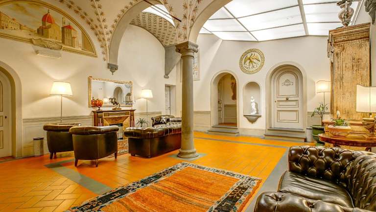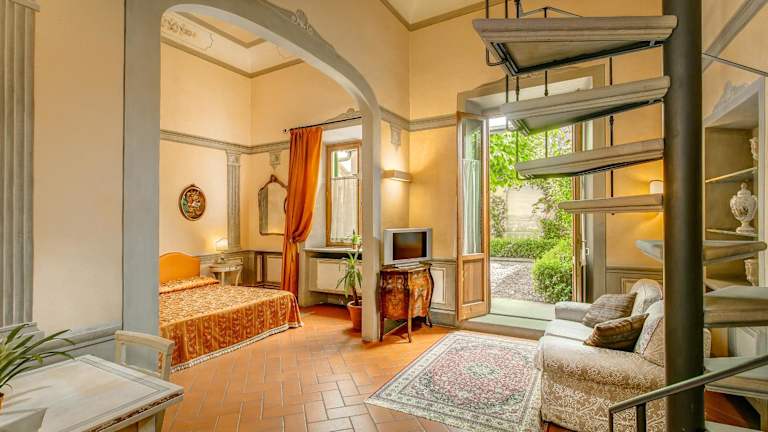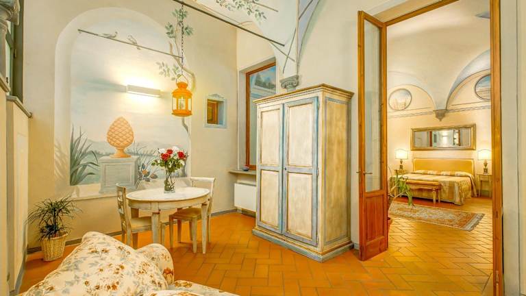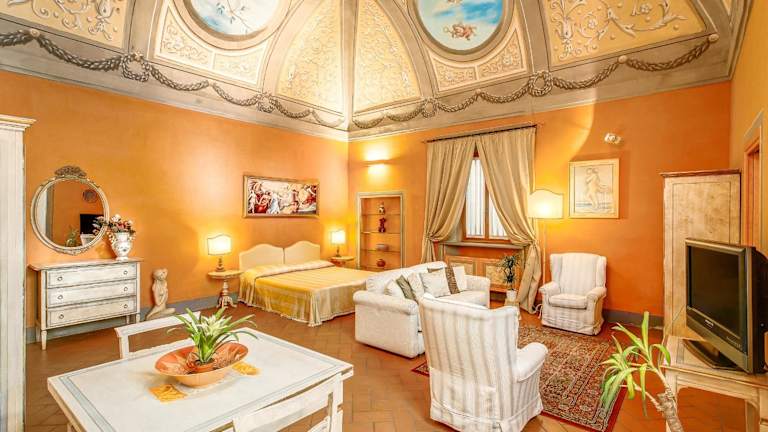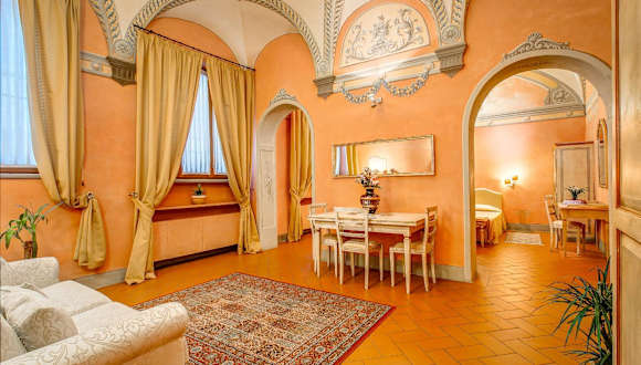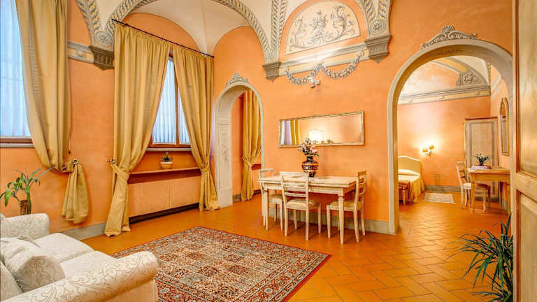 Das Hotel Firenzesuite bietet eine heimelige Atmosphäre mit Gewölbedecken und originalen Fresken in jedem Zimmer. Es ist eine Nichtraucherunterkunft und verfügt über kostenfreies Wifi. Der Check-in ist ab 14:00 Uhr möglich, der Check-out bis 11:00 Uhr. Haustiere sind gegen Gebühr erlaubt, und es werden spezielle Dienstleistungen wie Baby-/Kinderbetreuung angeboten. Die Rezeption bietet Eintrittskarten für Galerien und Museen an.