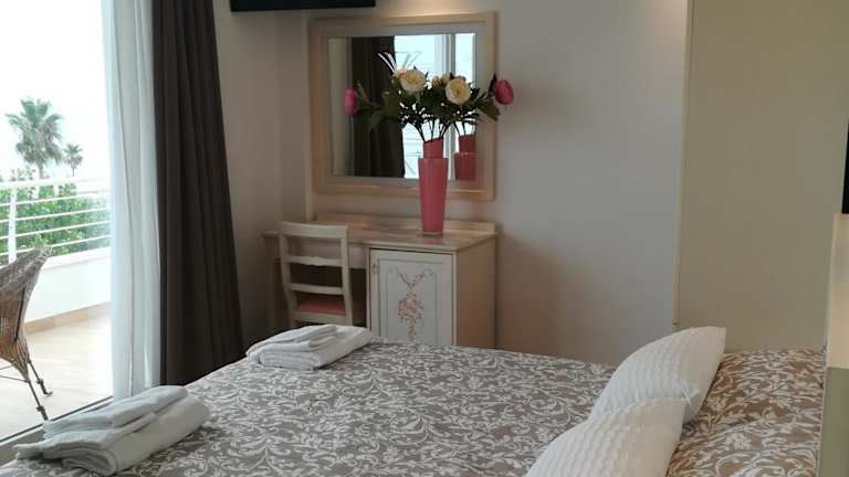 Die Zimmer im Hotel Flora sind komfortabel und klimatisiert. Jedes Zimmer verfügt über einen eigenen Balkon mit Meerblick. Zur Ausstattung gehören ein Schreibtisch, ein Wasserkocher, ein Kühlschrank, eine Minibar, ein Safe, ein Flachbild-TV, eine Terrasse und ein eigenes Bad mit einem Bidet. Einige Zimmer verfügen sogar über eine voll ausgestattete Küche mit einem Geschirrspüler und einem Kochfeld.