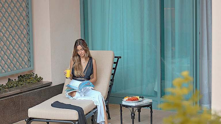 Die klimatisierten Zimmer sind modern ausgestattet und verfügen über ein Wohnzimmer, eine Küche sowie ein Badezimmer. Jedes Zimmer bietet einen Balkon oder eine private Terrasse, oft mit Blick auf das Meer. Weitere Annehmlichkeiten sind eine Minibar, ein Safe, ein TV-Gerät und kostenfreies Wifi. Auch rollstuhlgerechte Zimmer mit speziellen Badezimmern sind buchbar.