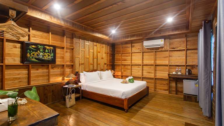Die heimeligen Zimmer sind mit Holzmöbeln ausgestattet und verfügen alle über einen Balkon mit Meerblick. Jedes Zimmer hat ein eigenes Bad mit Dusche. Die Gestaltung der Zimmer trägt zur wohlfühlenden Atmosphäre des Resorts bei.