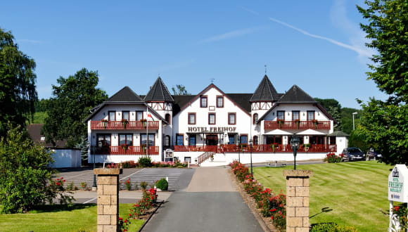 Das Hotel Freihof befindet sich am Rande des malerischen Weserberglandes, nur 5 km von der Herforder Brauerei entfernt. Die umliegende Landschaft ist ideal für Unternehmungen wie Wandern und Velofahren. Der Bahnhof Löhne ist 8 km entfernt und die Autobahn A30, die nur 2 km entfernt ist, ist schnell und bequem erreichbar.