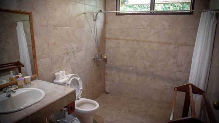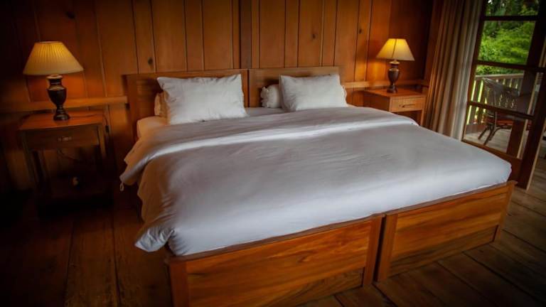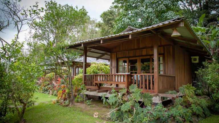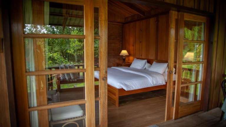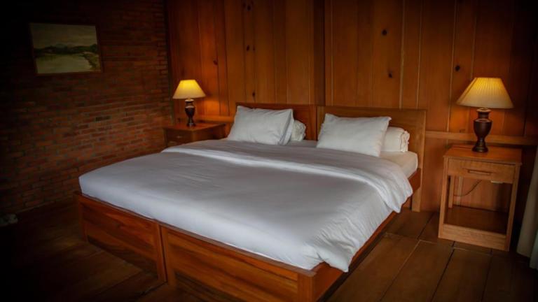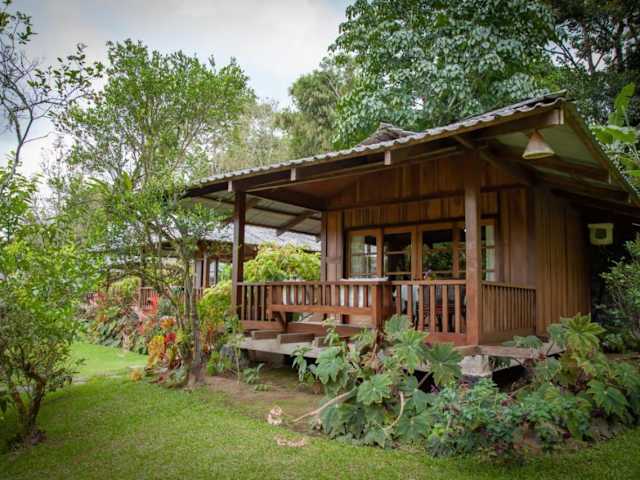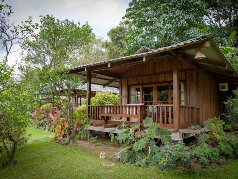 Die Zimmer sind holzverkleidet und ausgestattet mit einem Sitzbereich sowie einer Terrasse oder einem Balkon. Jedes Zimmer verfügt über ein eigenes Bad mit Warmwasserdusche, wobei einige Zimmer zusätzlich eine Badewanne bieten.